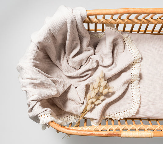 Over The Dandelions Organic Muslin Blanket With Cotton Tassels - Sand