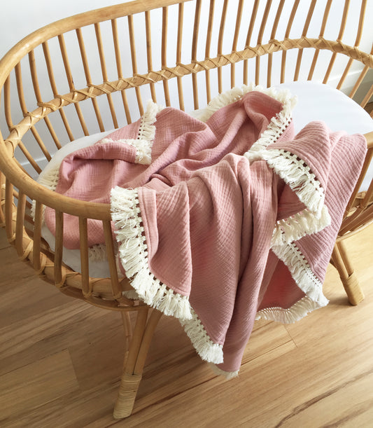 Over The Dandelions Organic Muslin Blanket With Cotton Tassels - Shell Pink