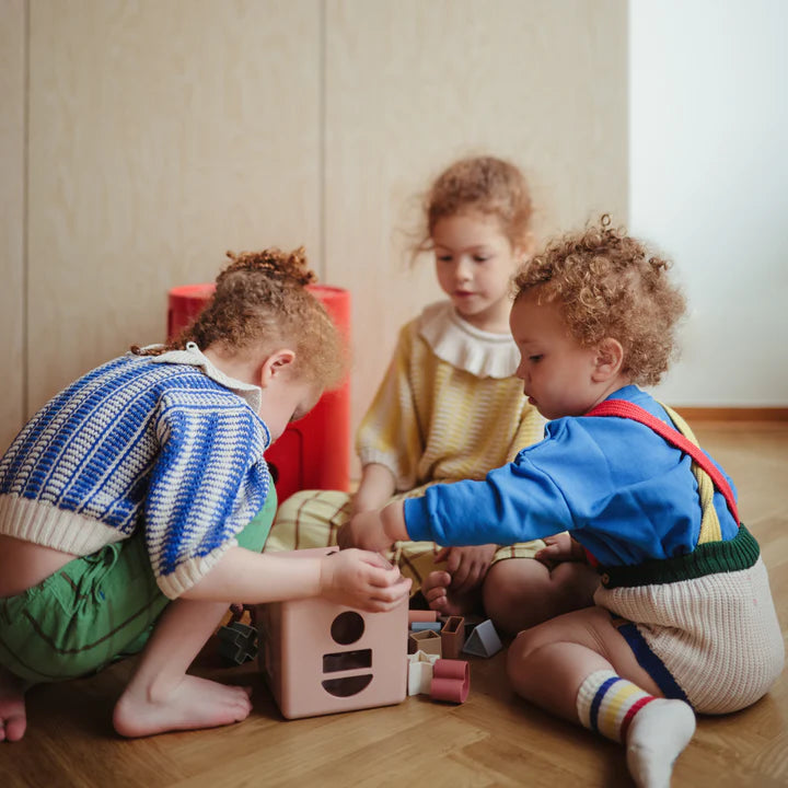 Our shape sorting box, made in Denmark, sets the stage for deeply engaged play with endless opportunities for hands-on learning. Featuring 12 soft-coloured shapes, it encourages little ones to refine their fine motor skills as they match each piece to its paired cutout.